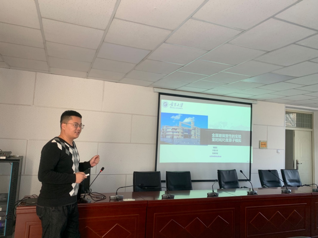 2023年11月22日下午,澳门六合彩投注平台 周震亚老师和黄永巍老师在博远楼217为我院教师作“金属玻璃塑性的实验室时间尺度原子模拟”和“拓扑绝缘体量子点中的太赫兹辐射”专题报告会。