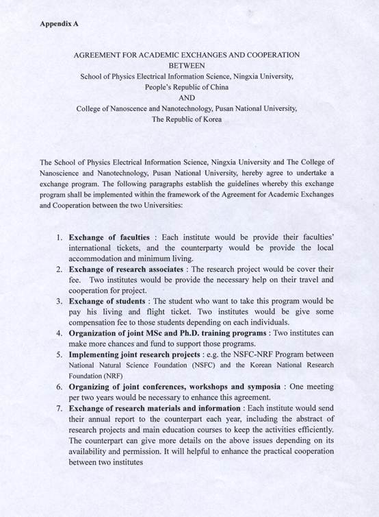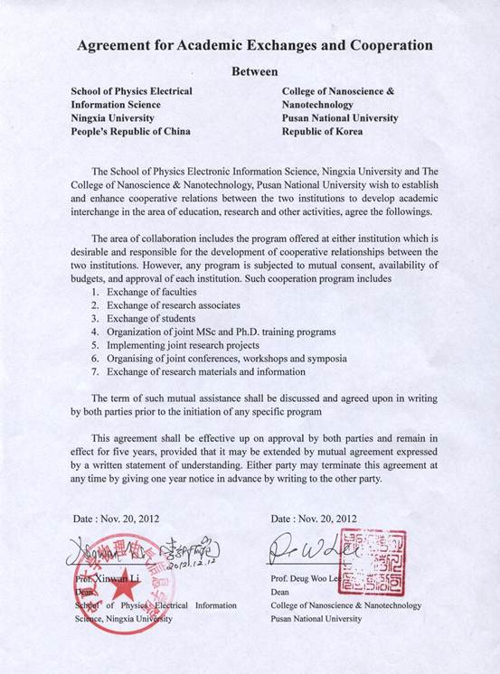 宁夏大学物理电气信息学院与韩国釜山大学纳米科学与纳米技术学院于2012年12月12日正式签署学术交流与合作协议。此次合作共计5年,生效日期自2012年12月12日至2017年12月12日。