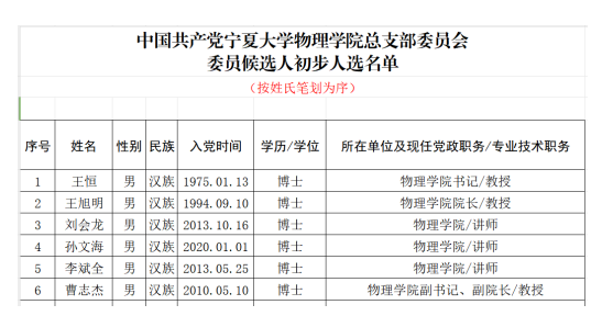 根据宁夏大学组织部《关于进一步规范基层党组织建设工作的通知》(组织部〔2023〕7号)精神和要求,结合澳门六合彩投注平台 党员实际,按照20%的差额比例推荐6名学院党总支委员候选人预备人选,经向全体党员征求意见后予以公示,名单如下表。公示时间:2023年10月1日—2023年10月7日;联系人:曹志杰;联系电话:0951-2061004。