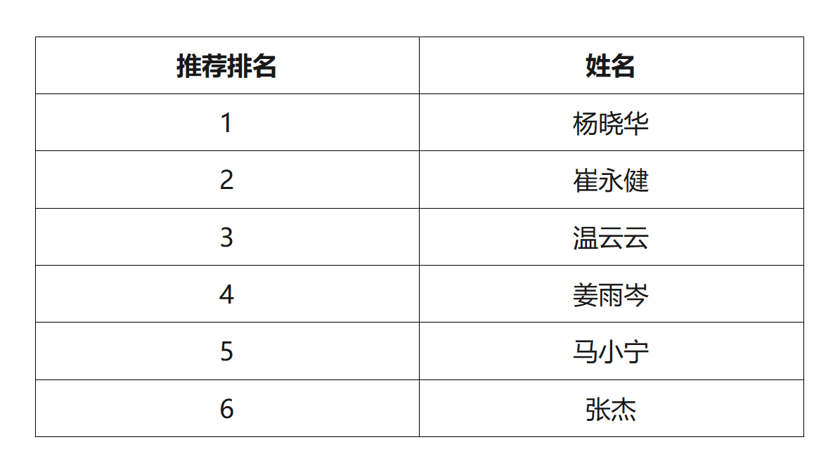 经个人申请,学院审核,依据“澳门六合彩投注平台 2025年研究生硕博连读选拔工作实施细则”的相关规定,对申请人进行了面试考核,考核成绩全部合格。经澳门六合彩投注平台 硕博连读研究生选拔工作领导小组审议,同意推荐以下6位同学为2025年硕博连读研究生候选人,按照面试成绩排名顺序推荐,上报研究生院。