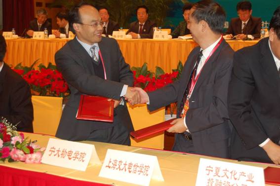 2011年9月20 日上午,宁夏大学物理电气信息学院与上海交通大学电子信息与电气工程学院在银川国际饭店签订了两院合作协议.这次协议签订是借2011年中国(宁夏)引进海内外高层次人才合作洽谈会的平台举行的.我院院长李新碗教授和上海交大电信学院常务副院长毛军发教授参加了协议签署仪式. 同时,宁夏回族自治区政府还为上海交大电信学院常务副院长毛军发教授颁发了自治区特聘专家. 本次两院合作协议的签署和特聘专家的聘请是继今年9月10日上海交通大学和宁夏大学对口援建十周年活动的进一步推进,标志着两校深度合作的开始.