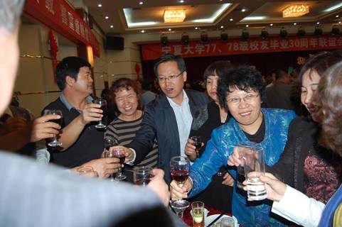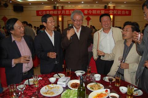 会后,合影留念。晚上6:30,在轻松欢快的音乐声中,全体校友步入学校为返校校友准备的晚宴。