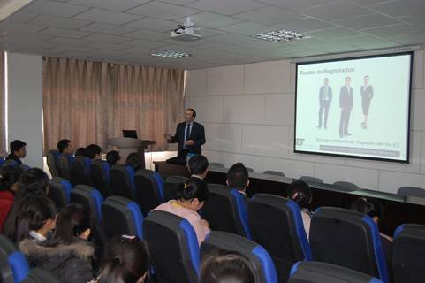 2012年10月21日下午,英国工程技术学会皇家注册工程师、资深会士,现任IET职业发展部门经理Dick Bacon先生在物理电气信息学院学术报告厅217室,为我院相关