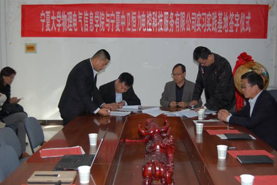 2014年10月15日下午,在宁夏大学物电学院210会议室举行宁夏大学物理电气信息学院与宁夏中卫恒力电控科技有限公司共建实习基地签字仪式,会议由物电学院任克亮副院长主持,参加会议的有学院领导车进、王旭明、王志霄、陈潮红、陈焕铭,宁夏中卫恒力电控科技有限公司总经理陈鸿庆、总工程师訾晓龙、工程部经理张文杰、综合办经理孟进福以及学院部分教师代表。