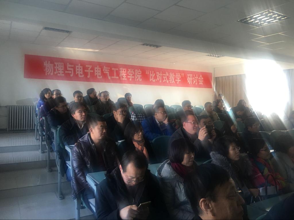 为推动我院教师教学能力的提升,促进青年教师成长,将现场教学实践与教学示范互相融合,通过传帮带、教学方法研讨等多种方式为青年教师提供与老教师切磋交流教学的良好平台,促进青年教师教学发展,根据教务处期中教学检查安排及学校教师教学发展研究中心《关于联合举办“比对式教学”专题研讨会的通知》要求,物理与电子电气工程学院于 11 月 23 日下午 2 点 在物理楼415室召开了全院教职工参加的本科课程教学观摩活动。