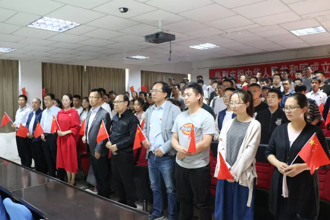 物电学院组织观看庆祝中华人民共和国成立70周年阅兵仪式“壮丽七十年,奋进新时代”。10月1日上午,庆祝中华人民共和国成立70周年阅兵仪式在北京天安门广场隆重举行。为营造共享伟大荣光、共铸复兴伟业的浓厚爱国氛围,引导师生在直播中接受爱国主义教育,激发师生爱国、爱党、爱社会主义的真挚情感。学院党委书记王志霄,院长王旭明,党委副书记马玉玲,副院长任克亮、郭中华,院办巨建楼老师及学生工作办公室、教科办部分教师与假期留宿学生齐聚学院319会议室集体观看国庆直播,为祖国庆生。
