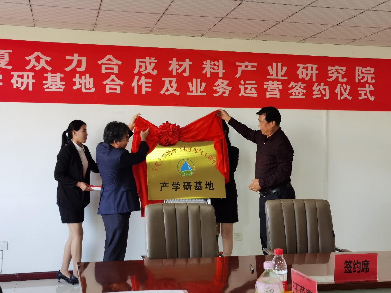 为了充分发挥高校的创新能力、科研水平及人才团队的优势,有效利用地方组织和企业的资源优势,通过高校的科研创新提升企业的技术水平,促进科研成果转化为具有经济效益的生产力,更好的为地方经济及行业产业发展服务,满足地方经济及行业产业的发展需求。2020年9月16日下午,宁夏大学物理与电子电气工程学院陈焕铭副院长一行七人赴石嘴山市科技园与宁夏众力合成材料产业研究院开展合作洽谈,签订战略合作协议。我院陈焕铭副院长和宁夏凌云集团有限公司执行董事王振分别代表双方为 “宁夏大学物理与电子电气工程学院产学研基地”揭牌。
