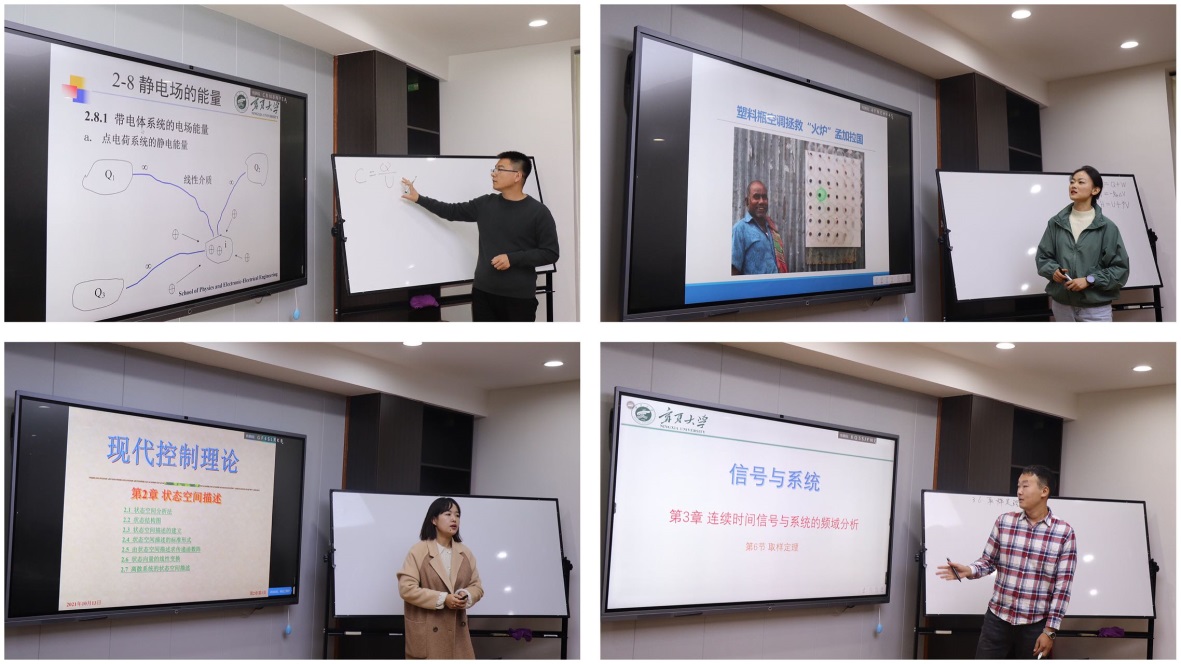 本次比赛共有来自物理系、信息工程系和电气工程与自动化系的8名青年教师参加,评委由学院教学指导委员会主任及委员构成。比赛分为现场讲课、评委打分及评委点评三个环节,重点考察青年教师的教学设计能力、授课基本功底及对教学方法、教学手段和教学理念的运用。