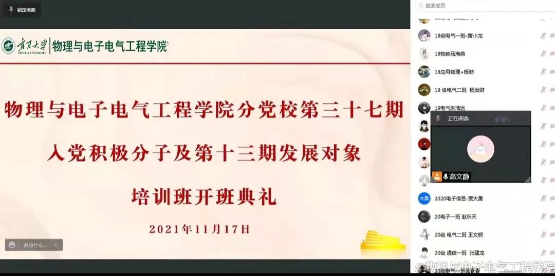11月17日下午,物理与电子电气工程学院分党校第三十七期入党积极分子暨第十三期发展对象培训班开班典礼以线上视频会议的方式举行。学院党委书记王志霄、副书记任克亮、刘剑,学生自动化专业党支部书记王子超、学生通信电子专业党支部书记孙礼胜、学生物理新能源专业党支部书记高文静、学生工作办公室老师王弄玉、专业型研究生党支部书记马明、学术型研究生党支部书记杨婷婷以及本期培训班全体学员参加了开班典礼,会议由高文静老师主持。