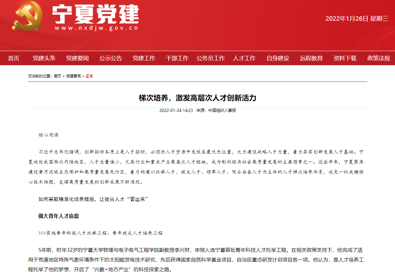 据宁夏党建网消息,近日《中国组织人事报》以《梯次培养,激发高层次人才创新活力》为标题,专版介绍了宁夏高层次人才培养政策。在该文中,全面介绍了宁夏着力构建以托举人才、拔尖人才、领军人才、院士后备人才为主体的人才梯次培养体系,支撑建设黄河流域生态保护和高质量发展先行区的“人才驱动”战略情况及其成果。我院李兴财博士作为首批“宁夏青年科技人才托举工程”人选的典型代表获得该文关注。