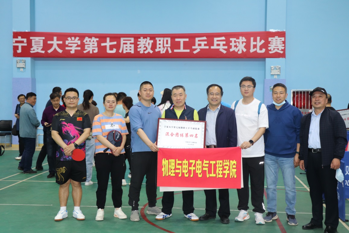 4月23日至24日,宁夏大学第七届教职工乒乓球比赛在怀远校区体育馆举行。经过激烈角逐,我院从27个代表队中脱颖而出,获得混合团体第四名,杜全忠获得男子单打第八名,这是自该项赛事举办以来我院取得的最好成绩。