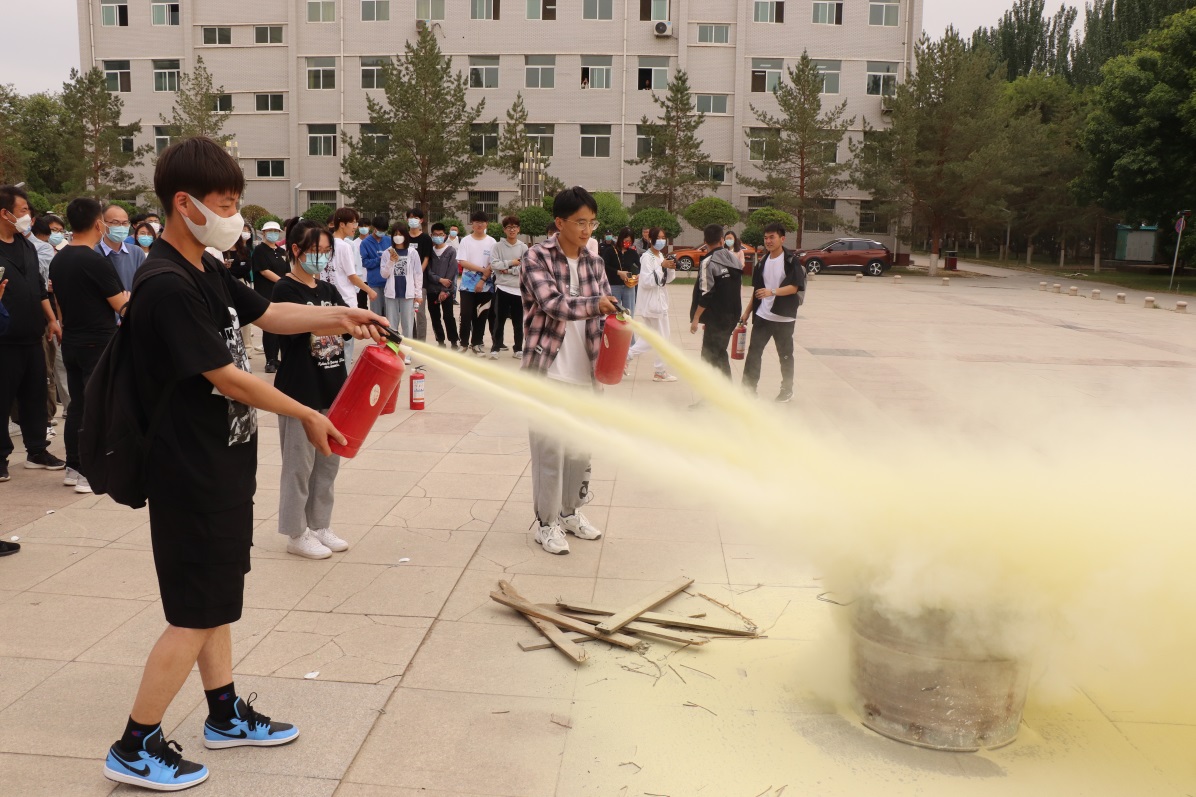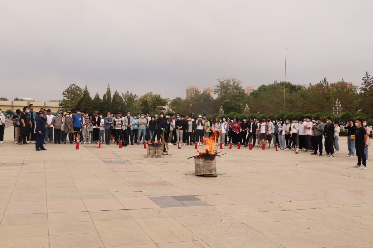 怀远校区五四广场,在专业人员的指导下,学院师生进行了干粉灭火器灭火演练,通过上手操作、实战演练,快速掌握了灭火器的使用方法。
