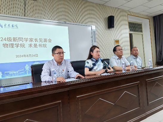 求是书院党委书记、院长武林波介绍了书院的育人理念、机构设置、解读书院“含弘致远 求是笃行”院训、书院第二课堂建设等情况,希望家长加强与学校的沟通,共同助力学生成长。求实书院党委副书记刘剑就新生入学初期生活注意事项、纪律要求、安全管理等事项向家长进行了说明。