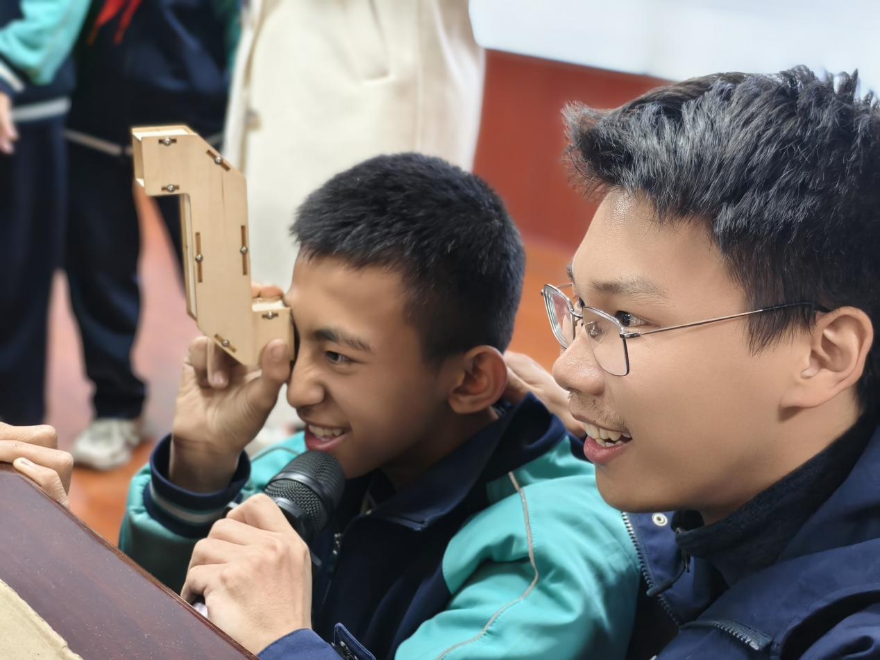在科普活动环节,由宁夏物理学会牵头、澳门六合彩投注平台 组建的宁夏物理微科普团队为同学们带来了一系列精彩的科学小实验。利用光的反射原理画出五角星,将图像投影在空中等;最后进行的激光照破气球实验,将光的能量以一种直观的方式展现出来。通过这一系列实验展示,同学们对光学现象有了更为深刻的认识,激发了他们对科学的浓厚兴趣。