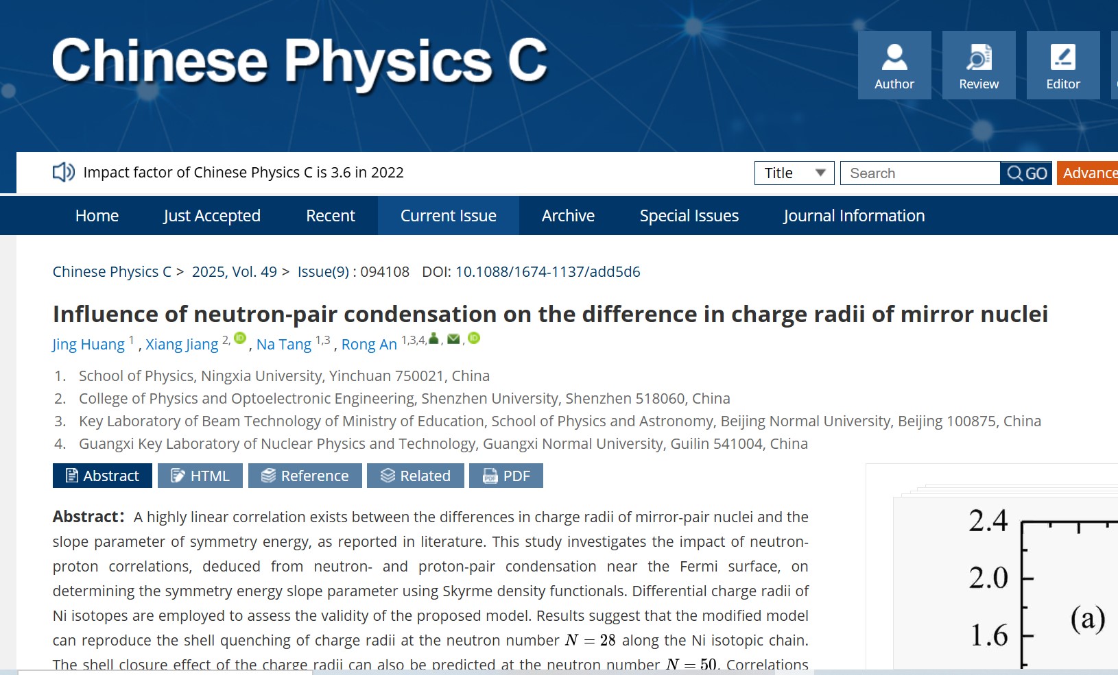2025年9月11日,澳门六合彩投注平台 本科生黄精(学号:12021241908,现为海南大学物理与光电工程学院硕士研究生)与深圳大学蒋翔博士、澳门六合彩投注平台 唐娜博士和安荣博士,在国际核物理期刊《Chinese Physics C》上发表题为《Influence of neutron-pair condensation on the difference in charge radii of mirror nuclei》的原创性论文。文章中考虑了中子对凝聚对镜像核电荷半径差值与对称能斜率之间关联性的影响,研究发现,考虑中子对凝聚后得到了比较硬的核物质状态方程(EoS)。该论文在线发表时间为2025年5月8日,黄精为该论文的第一作者,安荣博士为该论文的唯一通讯作者,澳门六合彩投注平台 为该论文的第一通讯单位。《Chinese Physics C》为粒子物理与原子核物理专业国际英文期刊,目前影响因子3.1(2024年),中科院分区为二区,JCR分区为Q1/Q2,在核物理领域具有非常高的认可度。