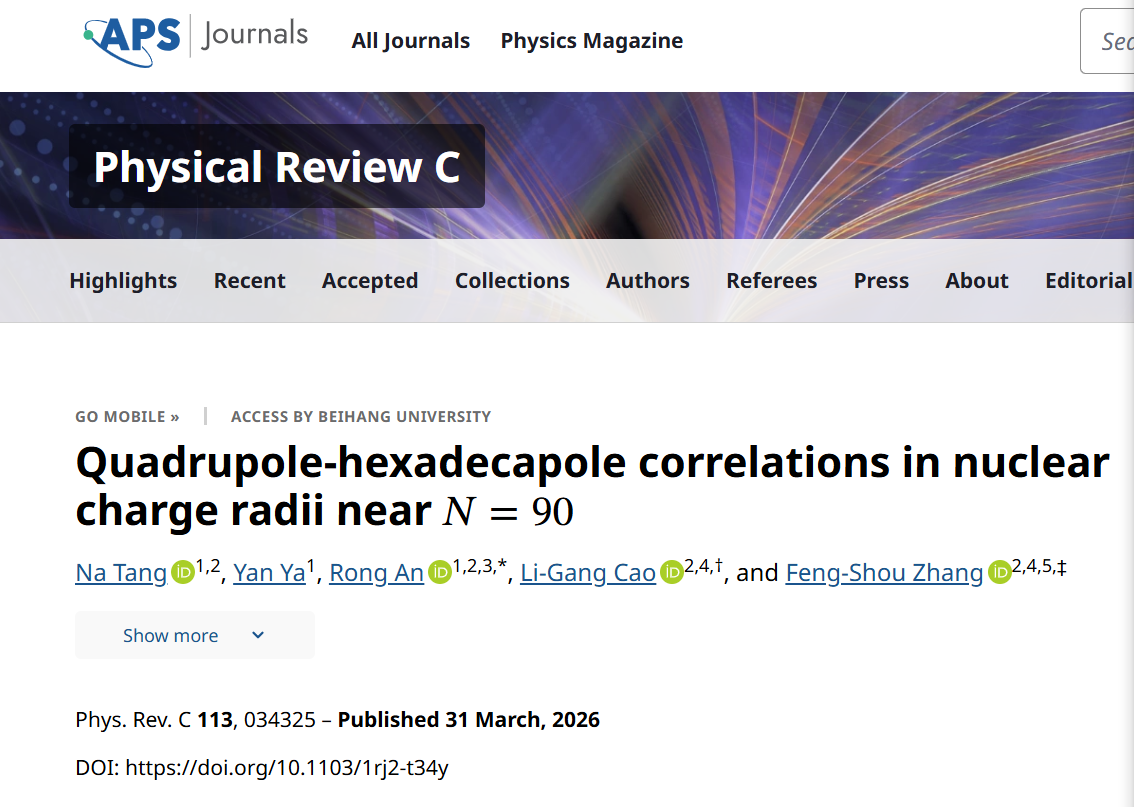 2026年3月31日,澳门六合彩投注平台 理论物理组青年教师唐娜博士和安荣博士与北京师范大学曹李刚教授和张丰收教授,在美国物理学会权威期刊《Physical Review C》上发表题为《Quadrupole-hexadecapole correlations in nuclear charge radii near N = 90》的原创性论文。文章通过同时约束四极形变和十六极形变的方法,系统描述了中子数N=90附近原子核电荷半径的演化趋势。文中指出,在N=90处原子核电荷半径会发生形状相变,同时四极矩和十六极矩之间的强耦合行为也会影响电荷半径的数值大小。唐娜博士是该论文的第一作者,2024级硕士研究生雅燕(学号:12024130700)为该论文的第二作者,安荣博士是该论文的第一通讯作者,澳门六合彩投注平台 为该论文的第一完成单位。