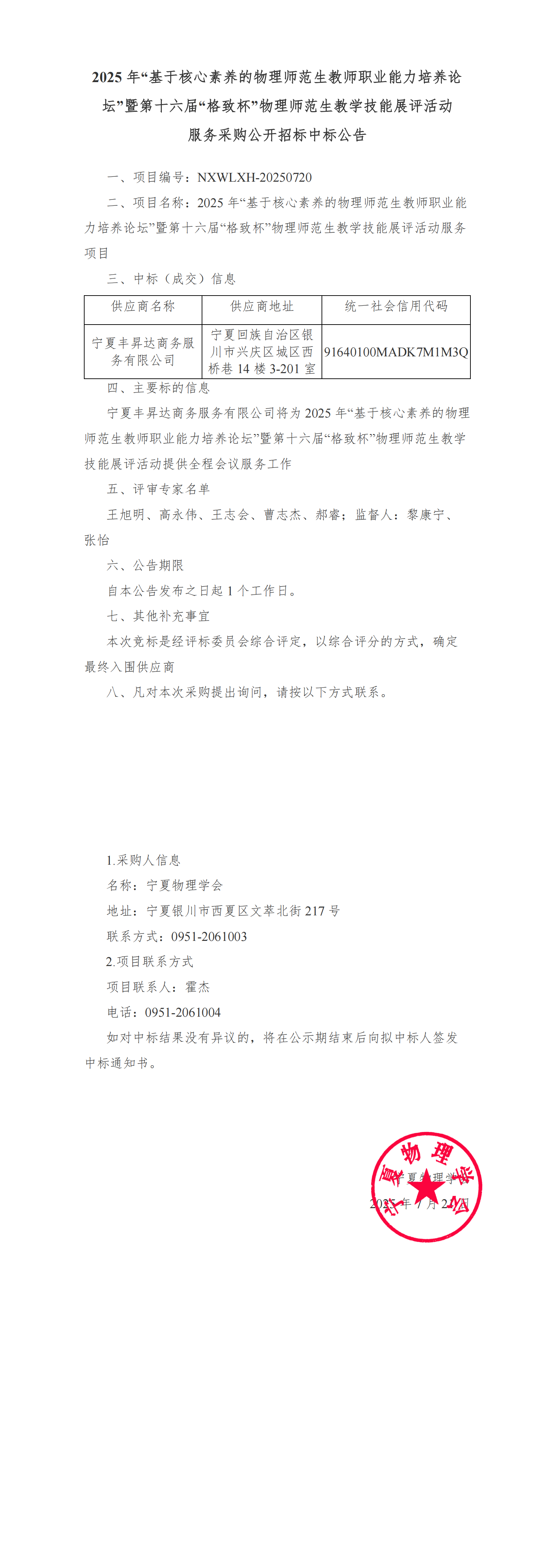 2025年“基于核心素养的物理师范生教师职业能力培养论坛”暨第十六届“格致杯”物理师范生教学技能展评活动服务采购公开招标中标公告