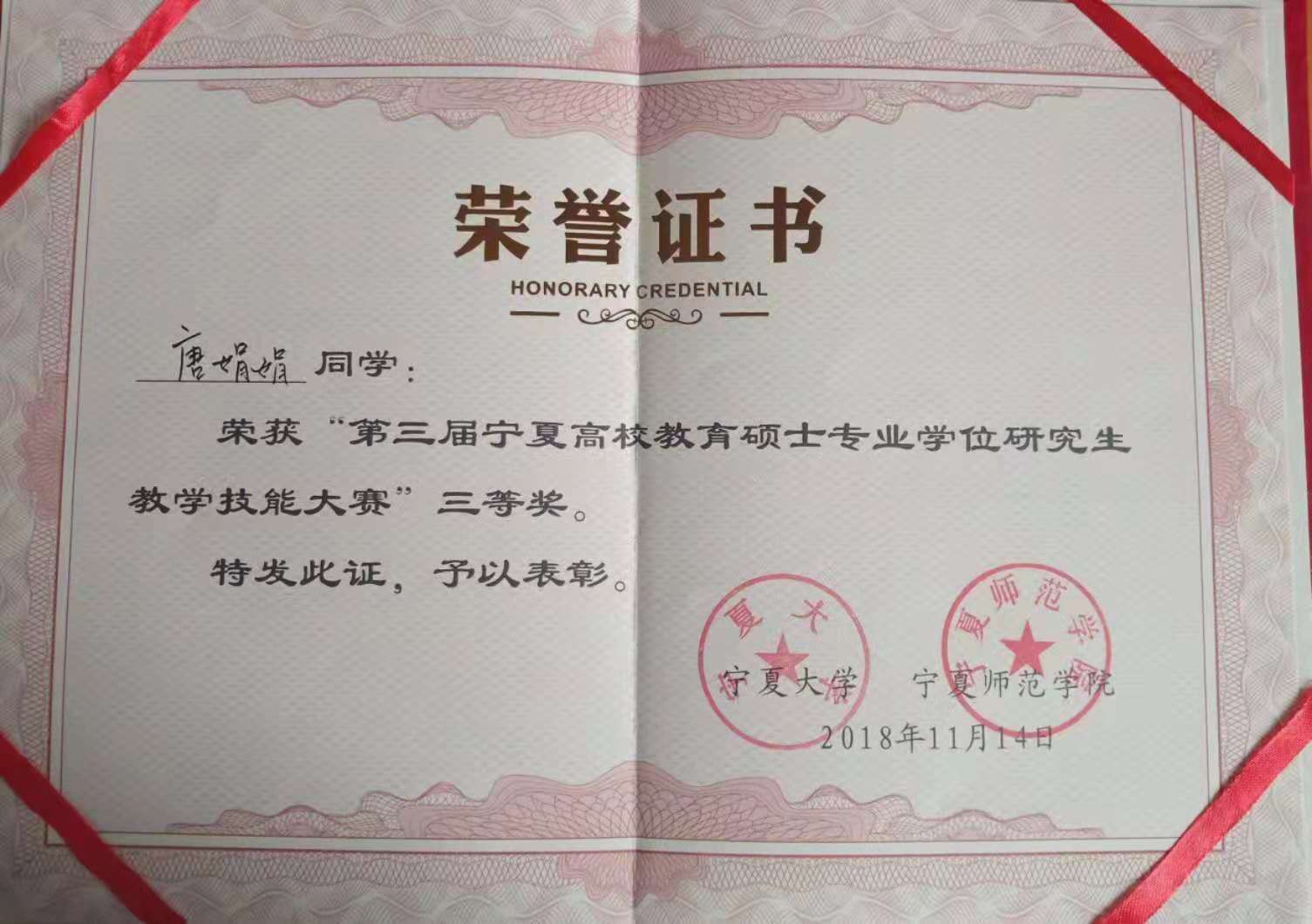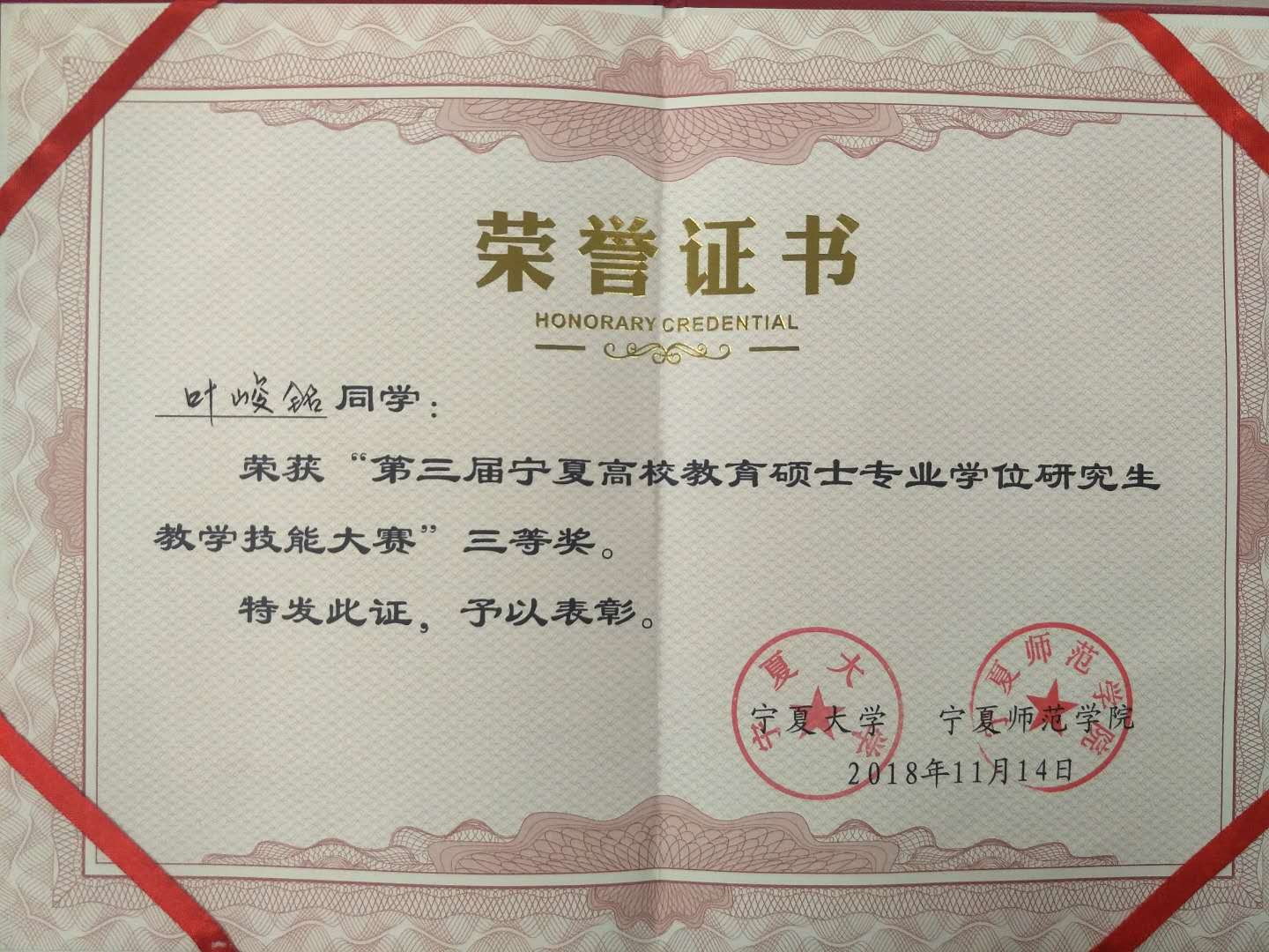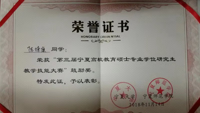 2018年11月14日,第三届宁夏高校教育硕士专业学位研究生教学技能大赛在宁夏大学成功举办。我院学科教学物理研究生叶峻铭和唐娟娟喜获三等奖,陈德康获得优胜奖。