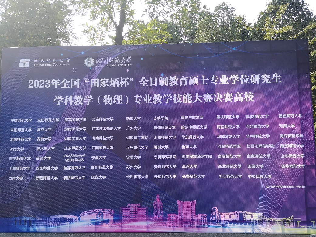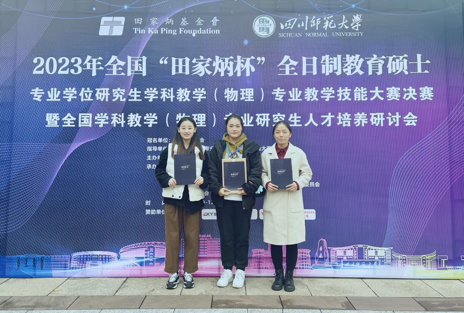 11月12日,2023年全国“田家炳杯”全日制教育硕士专业学位研究生学科教学(物理)专业教学技能大赛决赛在四川师范大学圆满落幕,我院选派的3名研究生从全国初赛中脱颖而出,与来自全国69所高校162名研究生同台竞技,李佳薇、麻心怡荣获二等奖,蔡雨荣获三等奖;指导教师郝睿、马玲被评为“优秀指导教师”。